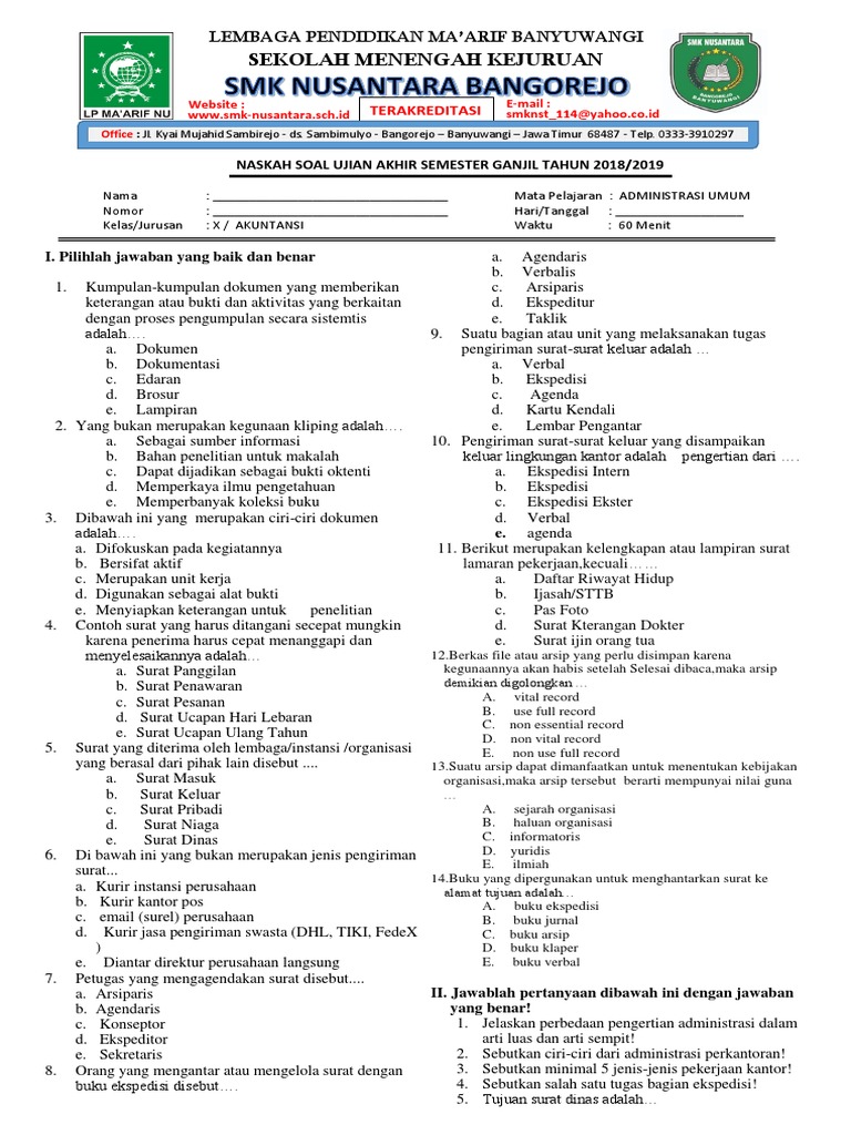 Contoh soal bahasa indonesia pg kelas 12 sma semester 1 kurikulum 2013. Contoh surat pengantar tunjangan profesi | administrasi sekolah. Naskah soal ujian sekolah mapel administrasi umum tahun 2021 paket a. Soal administrasi keuangan ini berisi 25 soal pilihan ganda dan seperti biasa di akhir postingan kangenge akan menyertakan link untuk mengunduh berkas soal tersebut. Peran tenaga administrasi dalam meningkatkan mutu layanan. Bagian pertama berisi tentang penjelasan umum. Contoh soal cpns 2021 administrasi umum ini tersedia juga dengan kunci jabawan dan formasi/jabatan administrasi umum ini tersedia di instansi pusat maupun di instansi pemerintah daerah. Latihan soal untuk ujian nasional sma smk z. Yang terdiri atas kepala sekolah, tenaga administrasi, tenaga perpustakaan, tenaga laboratorium, dan tenaga kebersihan sekolah. Terdapat empat instrumen soal untuk tertulis, yaitu instrumen 1a, 1b, 2 dan 3. Seleksi administrasi dilaksanakan oleh dinas pendidikan kab/kota untuk tk, sd dan smp. Oleh karena itu berikut ini kami berikan contoh deskripsi tugas tenaga administrasi sekolah dengan harapan dapat menjadi referensi bagi bapak/ibu kepala sekolah. Doc soal semester administrasi umum habibah 01 academia edu.